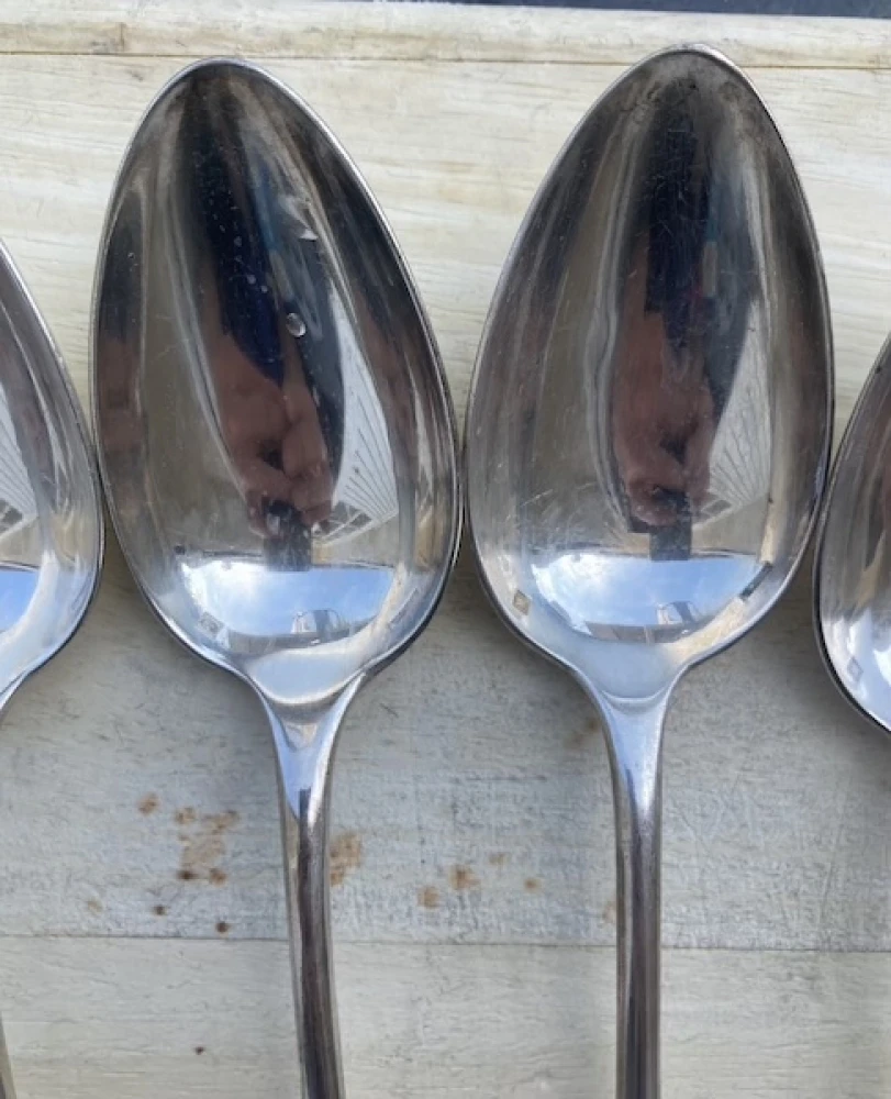 Ensemble de 10 cuillères à soupe Christofle Paris avec Monogrammes MP. Elles sont en métal argenté ou doré, et marqués d’une balance avec une abeille entre les plateaux, surmontée de quatre étoiles, deux rameaux en dessous et les lettres CC, le tout dans un ovale dans un rectangles. Ce poinçon a été utilisé sur une période allant de 1844 à 1935.