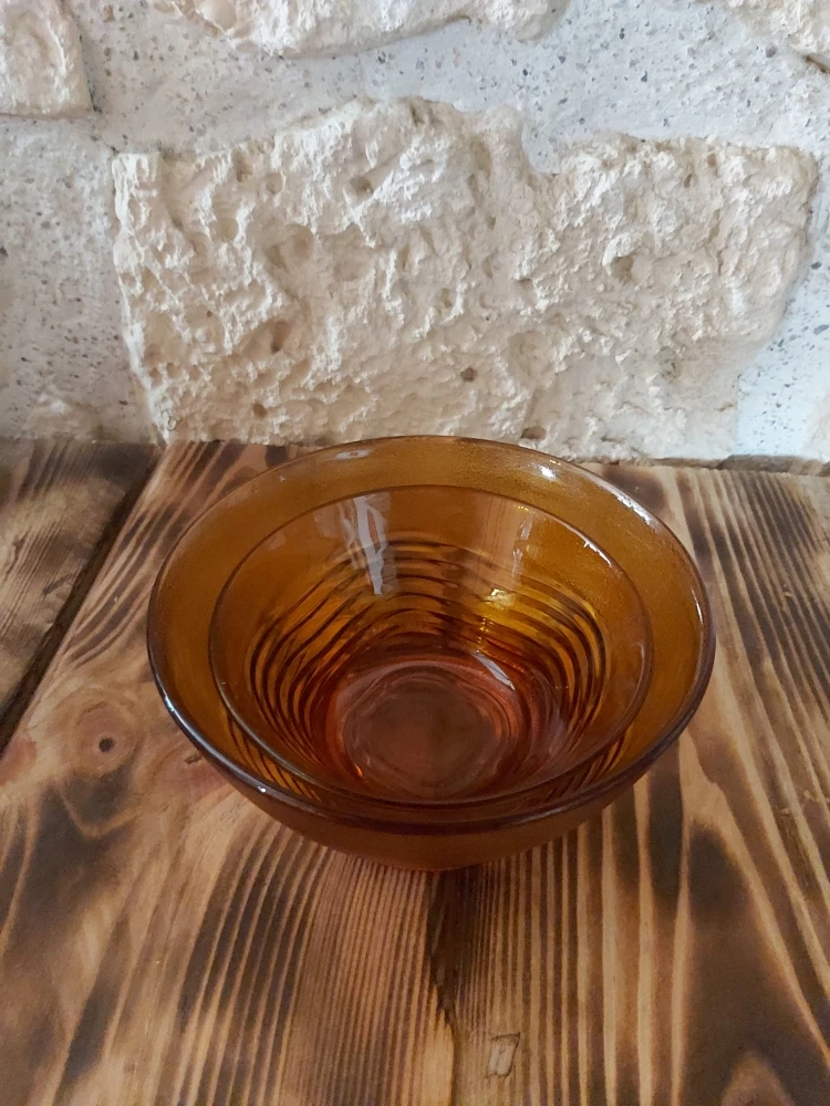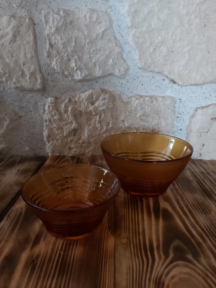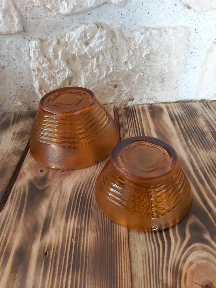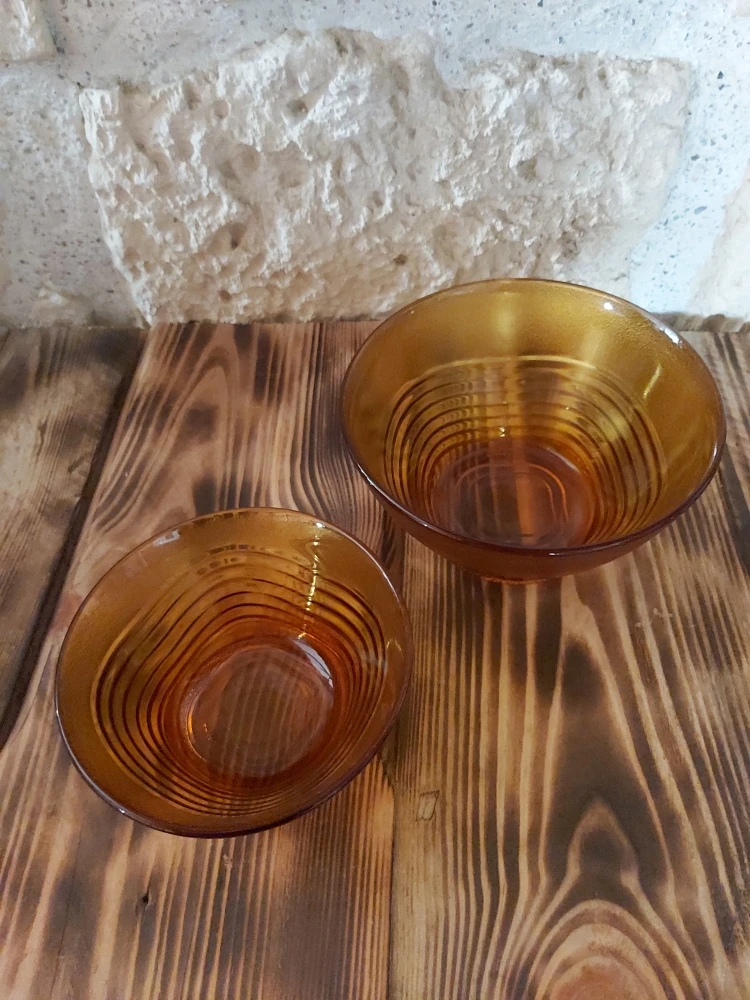 Ensemble de 2 bols en verre trempé de marque Duralex, modèle Ondine avec cette jolie teinte orangée comme on aime pour une cuisine vintage.