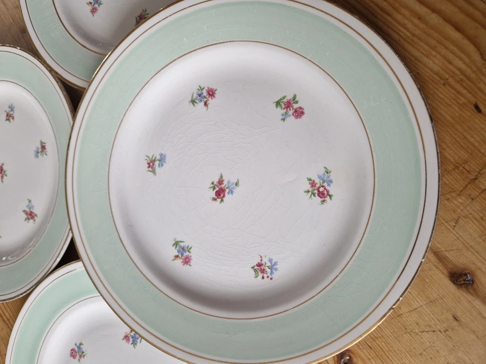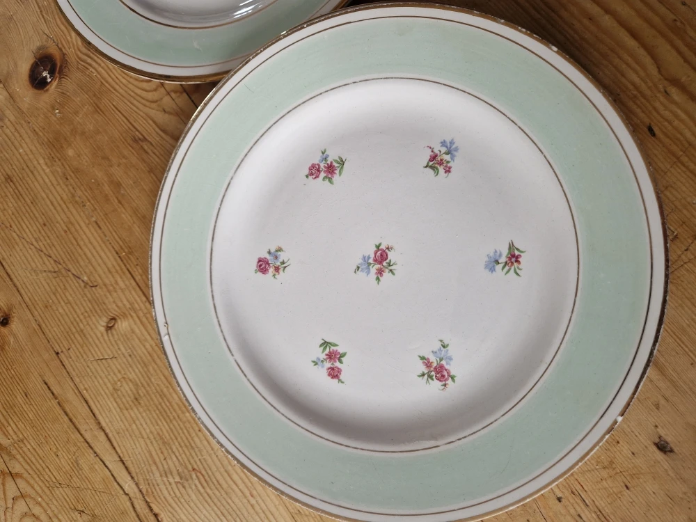 Il s agit sur cette série d’un décor floral en son centre et d’une bande verte sur le tour, un élégant liseré doré terminee les assiettes.