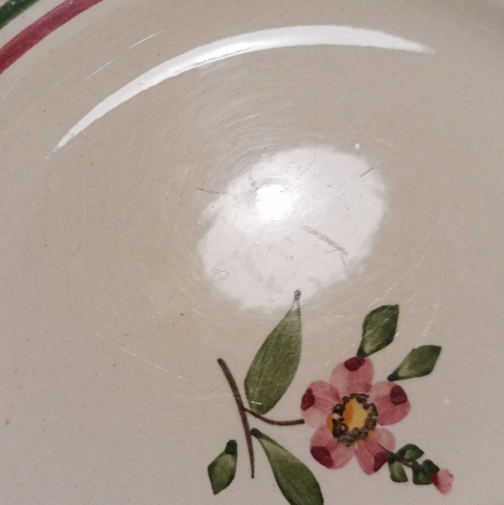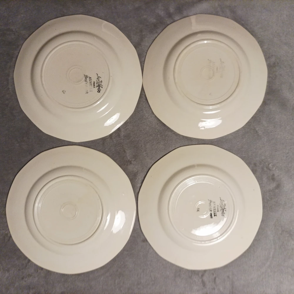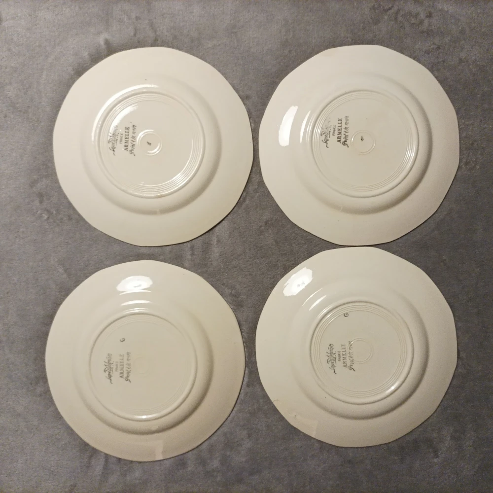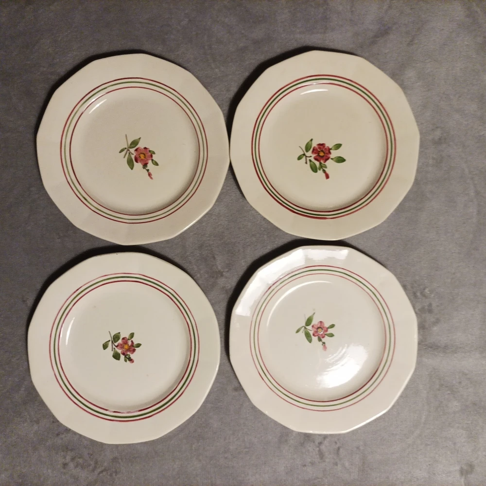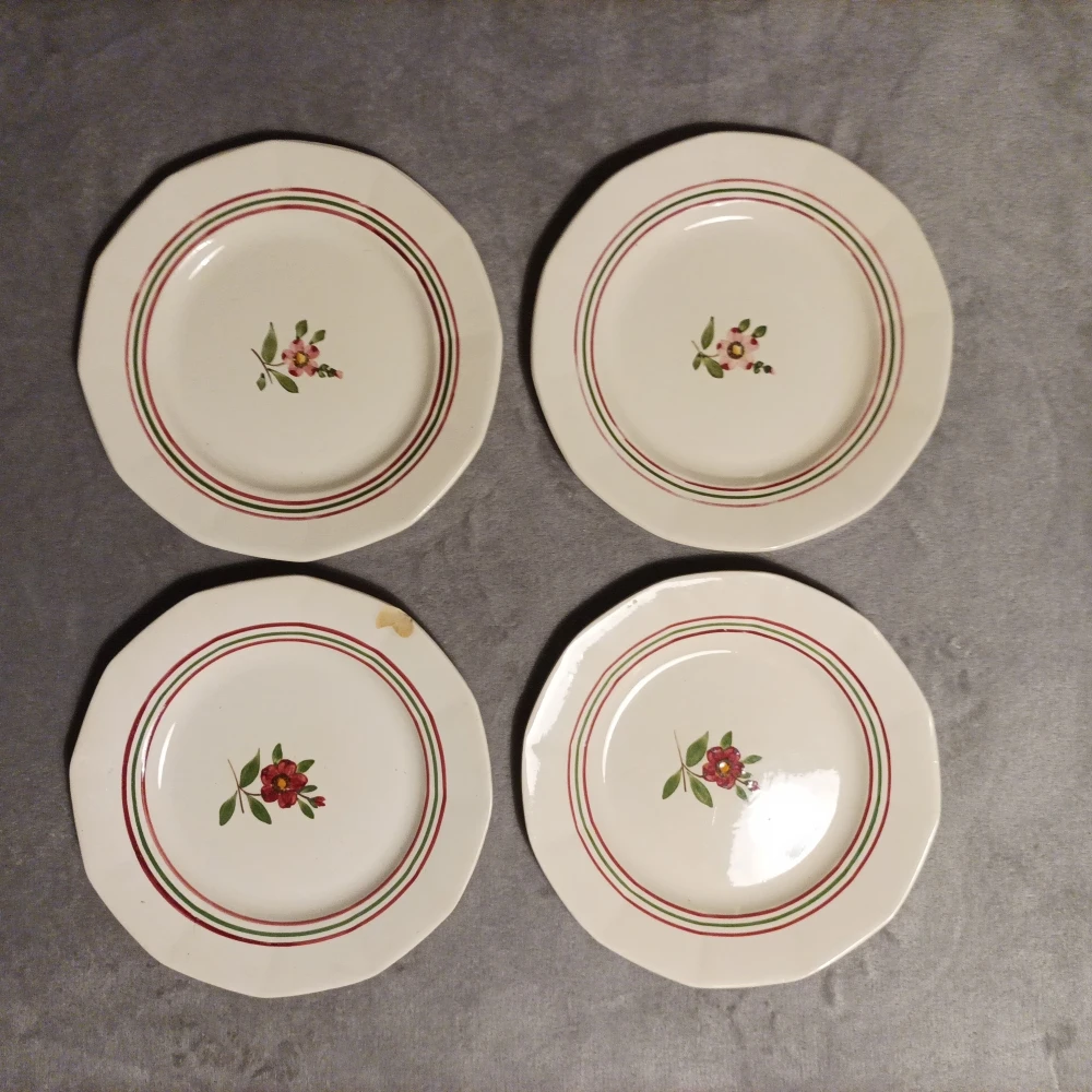 Une assiette présente un manque de matière, craquellement sous vernis, toute la vaisselle présente une usure d’usage par traces de frottements de couverts, quelques tâches, on peut voir également des imperfections de réalisation lors de leur conception. Une des assiettes n’a pas de marquage.