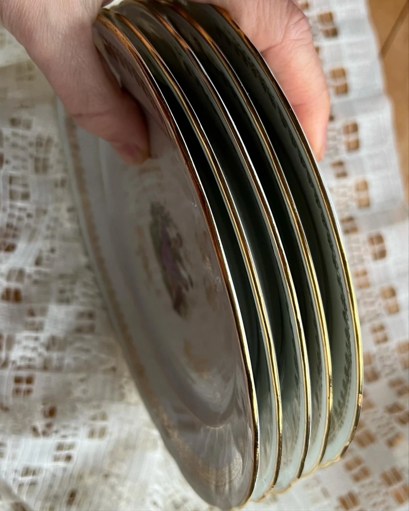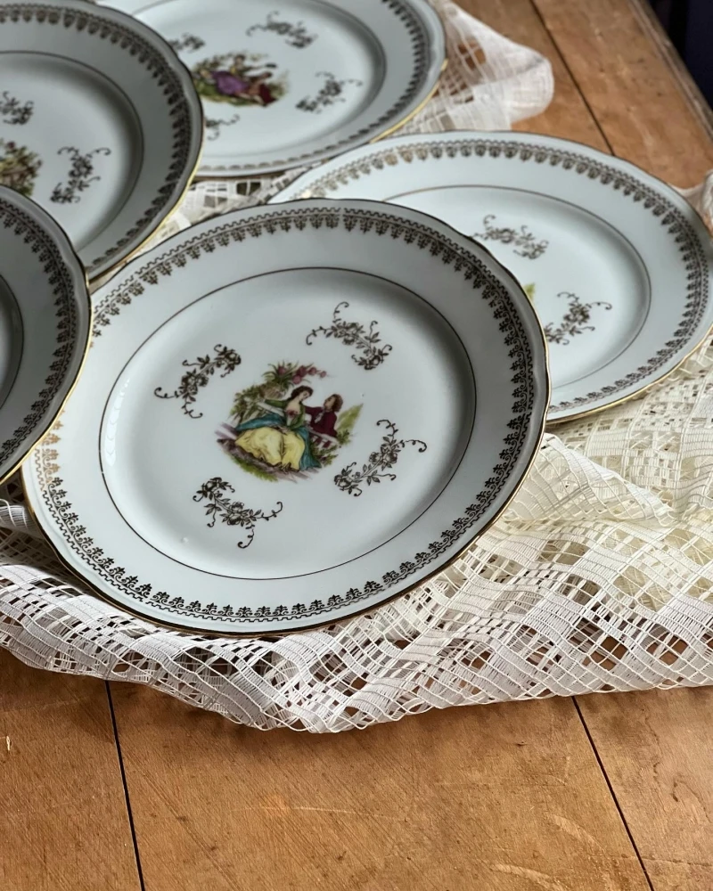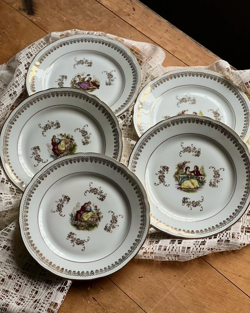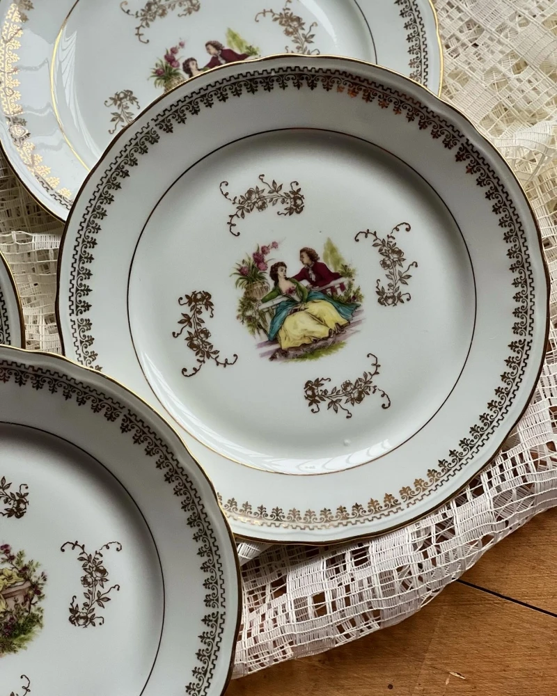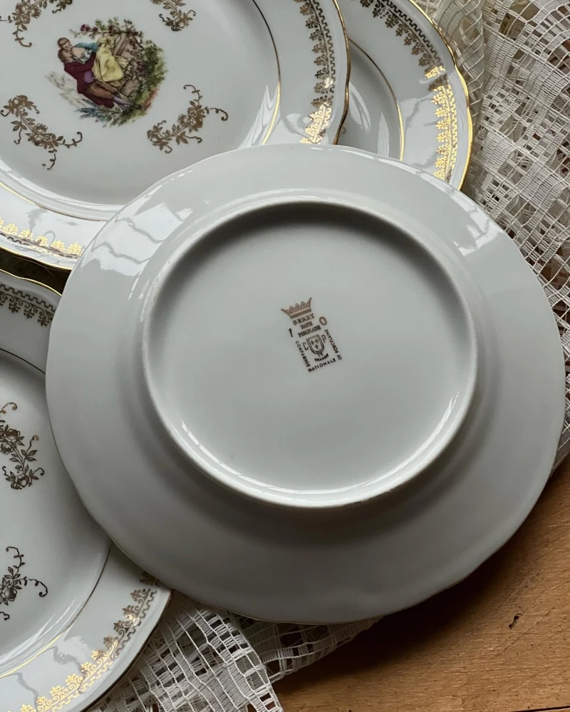 Les bordures des assiettes sont légèrement chantournées et garnies de filets d’or. Le dessus des assiettes est également entouré de filets d’or en bordure rococo. Au centre des assiettes, chaque scène est entourée de 4 ornements de végétation toujours en filet d’or. Ces assiettes peuvent compléter une collection ou s’harmoniser avec d’autres pièces de porcelaine du même style, que ce soit de la porcelaine Berry ou de Limoges.
