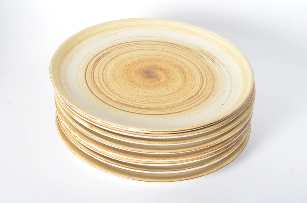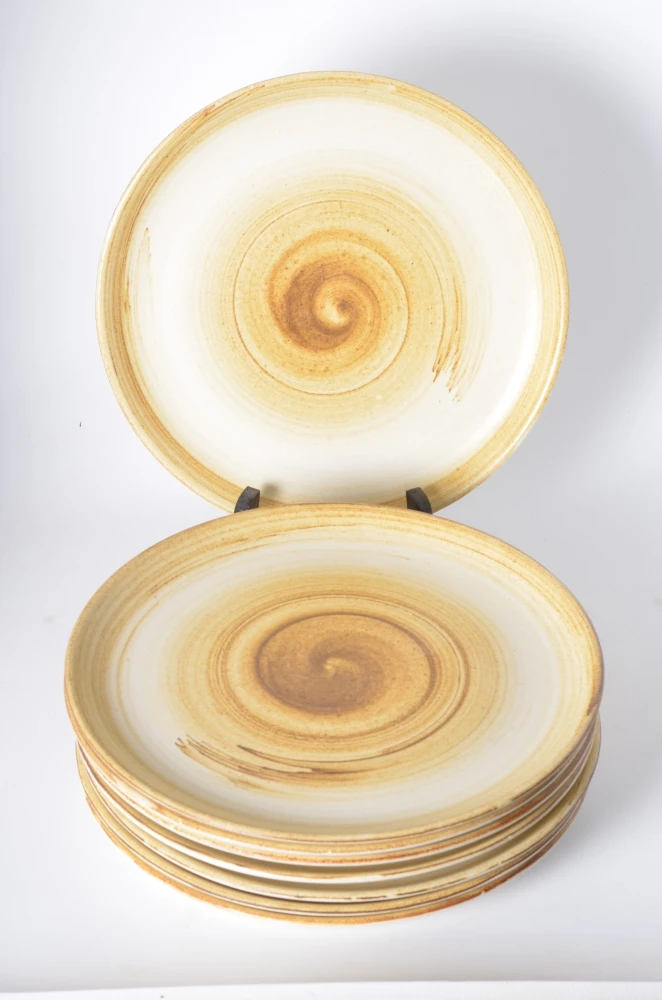 Lot de 8 assiettes plates motif tourbillon de marque Longchamp. Diamètre 24 cm, hauteur 2cm.