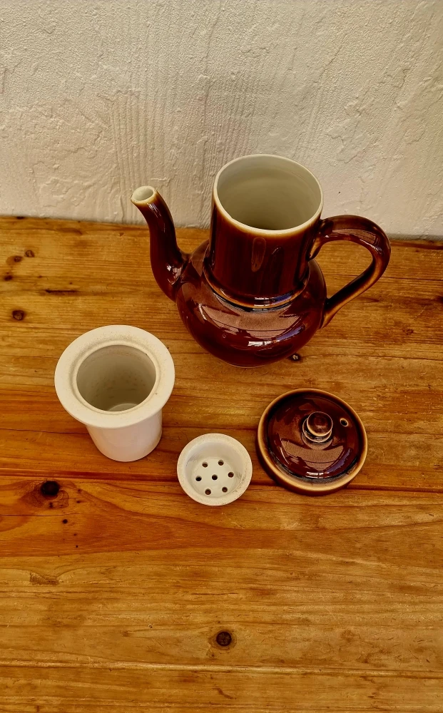 Magnifique cafetière en céramique marron des années 50. Elle se compose d’un filtre et d’un couvercle. Numérotée 4.