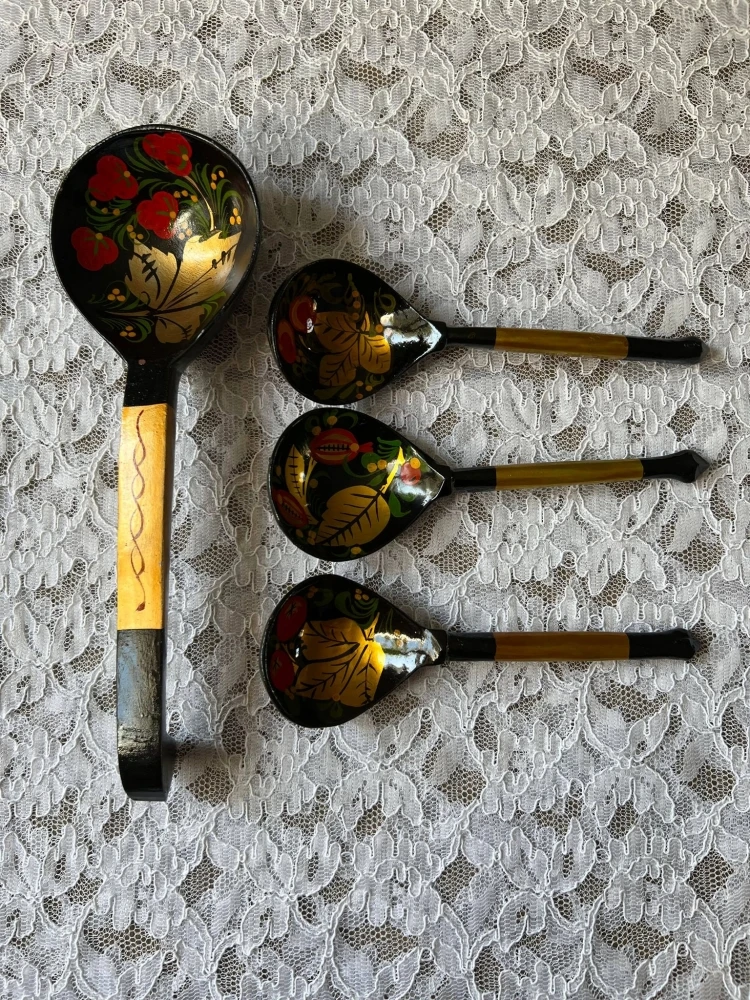 4 cuillères KHOKHLOMA Russe peintes à la main. 3 moyennes et 1 grande.