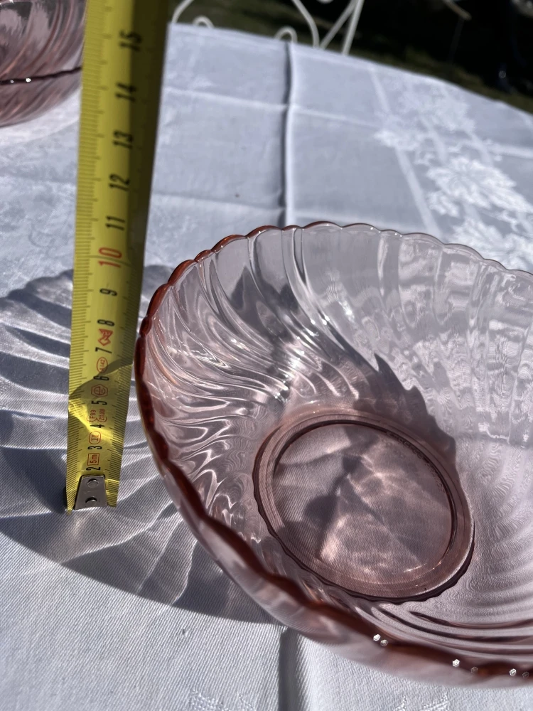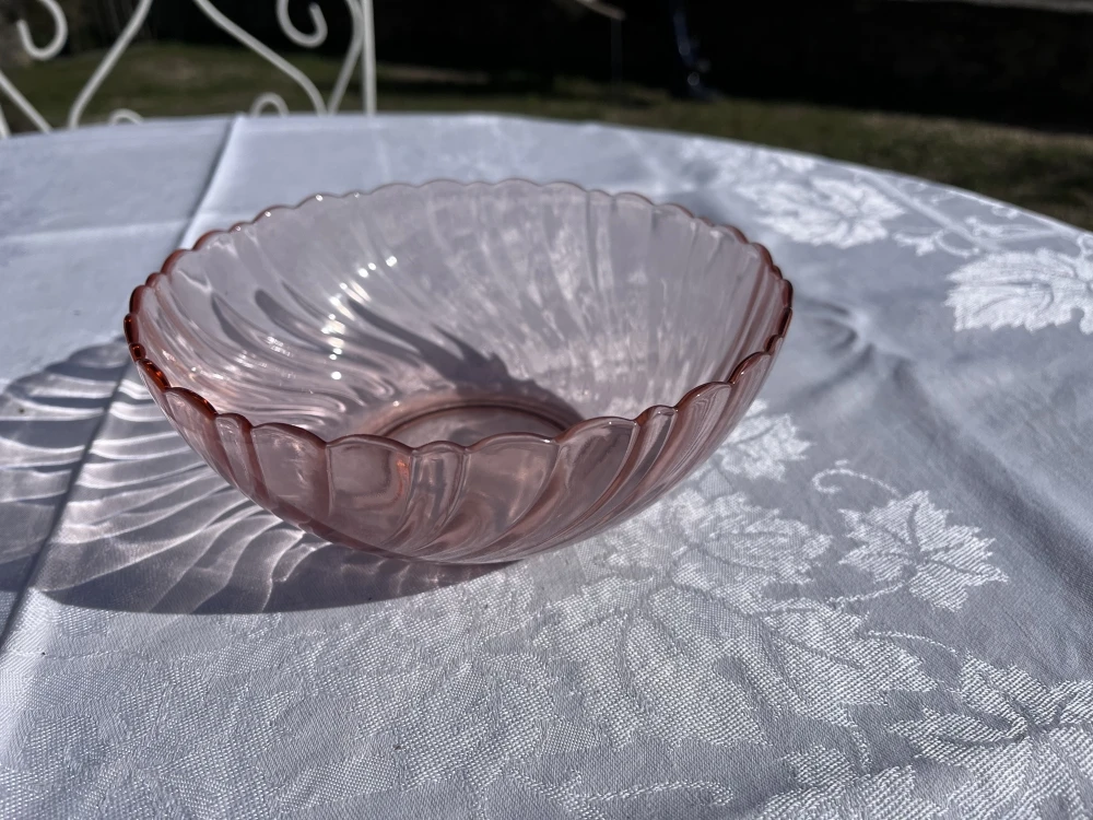 Petit saladier vintage Arcoroc modèle Rosaline en verre rose translucide.