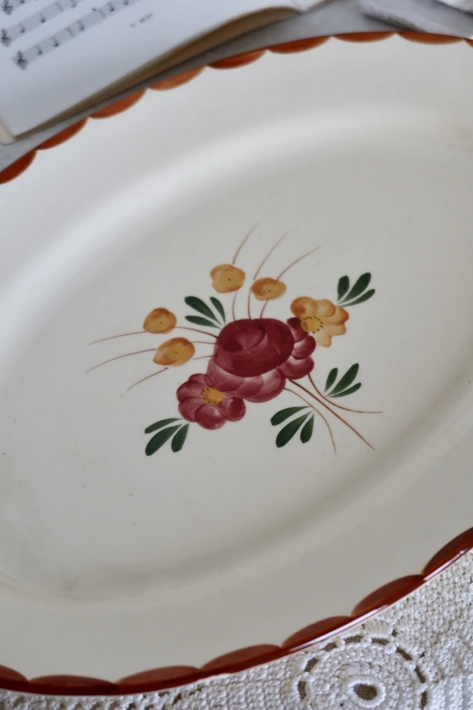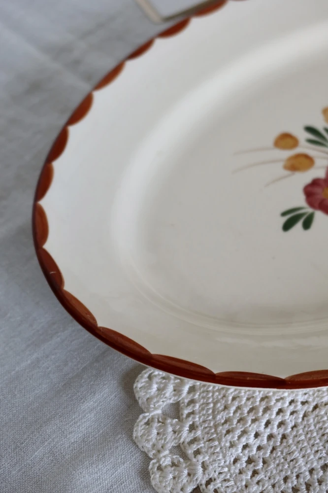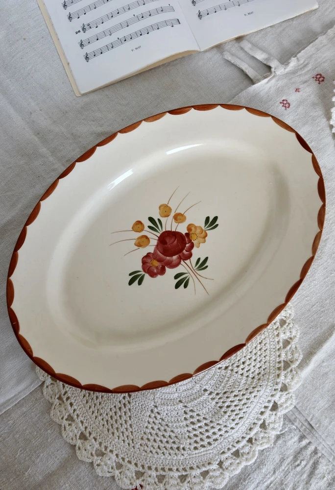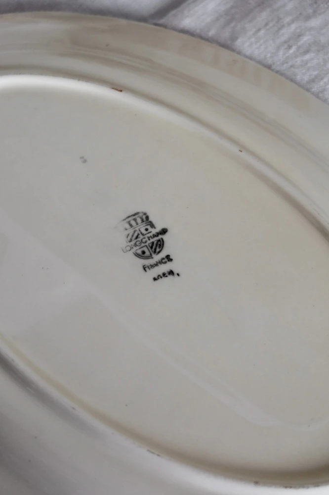 Joli plat de service ancien Longchamp, faïencerie française des années 1950, peint à la main.