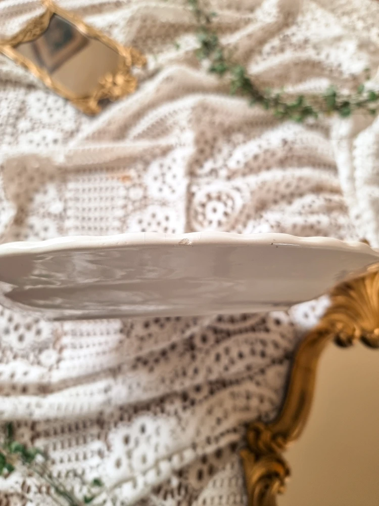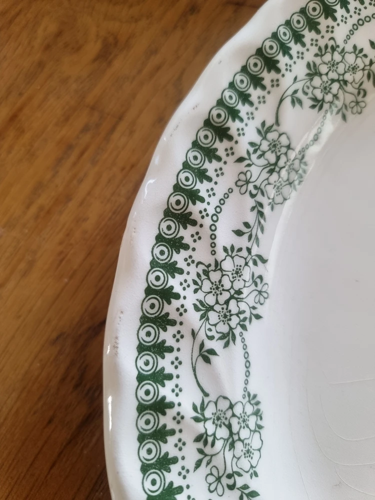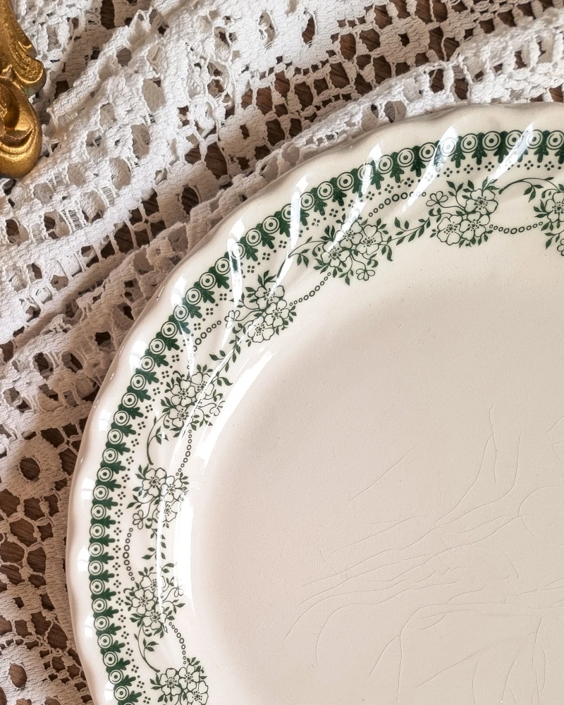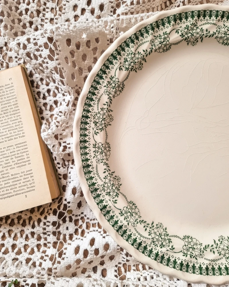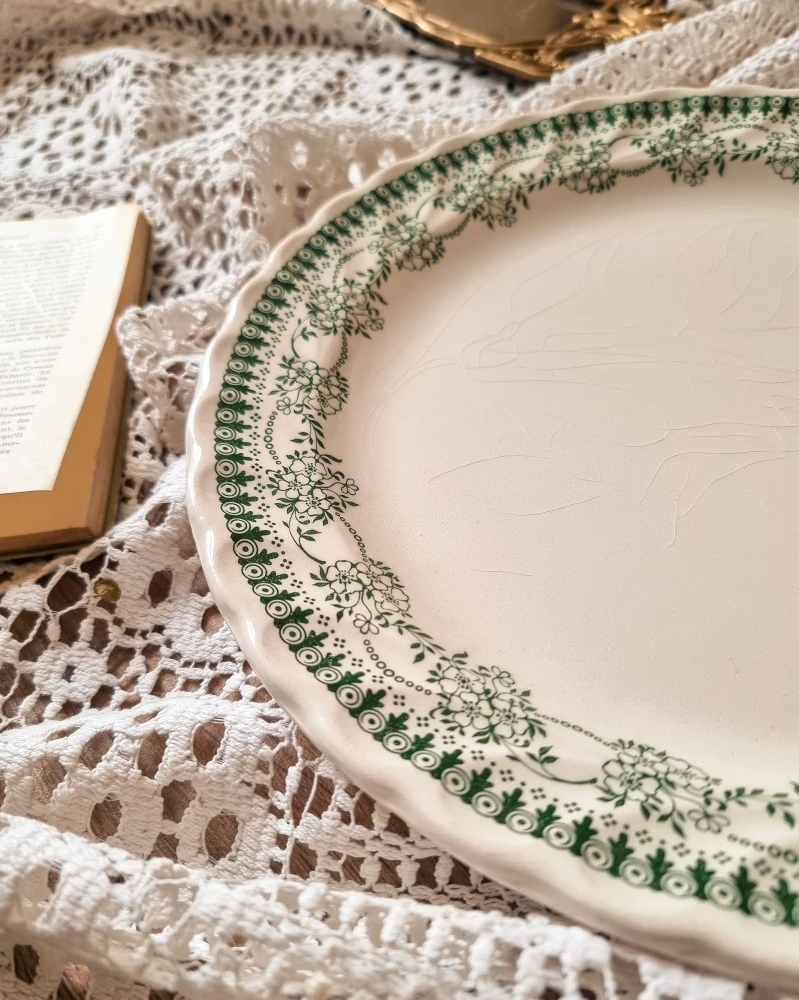 Superbe motifs floraux déposé en arabesque sur tout le contour du plat, le tout d’une couleur vert sapin. Reliefs parcourant les bords supérieurs du plat, joliment exécuté.