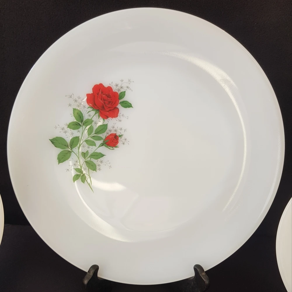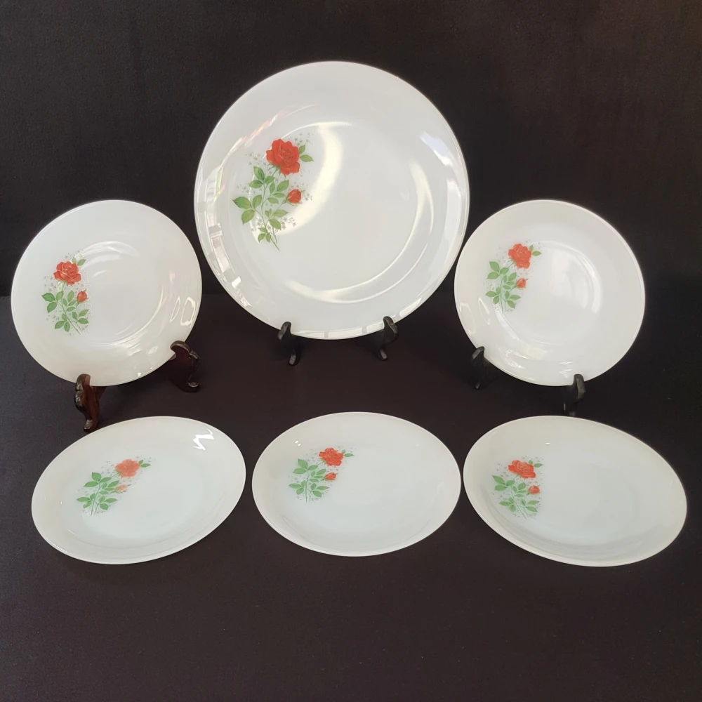 Un plat de service et 5 petites assiettes, le tout de la maison Arcopal, il s’agit du modèle Rose de France, version rose rouge. Le plat est en parfait état, le dessin est atténué sur les assiettes et elles ont des traces de frottements. Plat 29 cm, assiettes 19 cm.