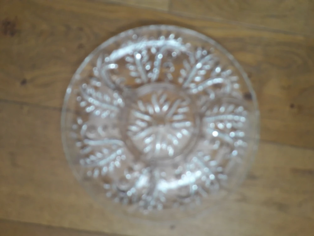 Plat en verre rond diamètre de 29 cm composé d’un compartiment central rond et de trois compartiments périphériques. Idéal pour présentation de tapas, biscuits apéritifs ou crudités. Date des années 50. Décoration inspirée des décors vénitiens et du style Cote d’Azur en vogue à l’époque. Verre transparent. Belles proportions.
