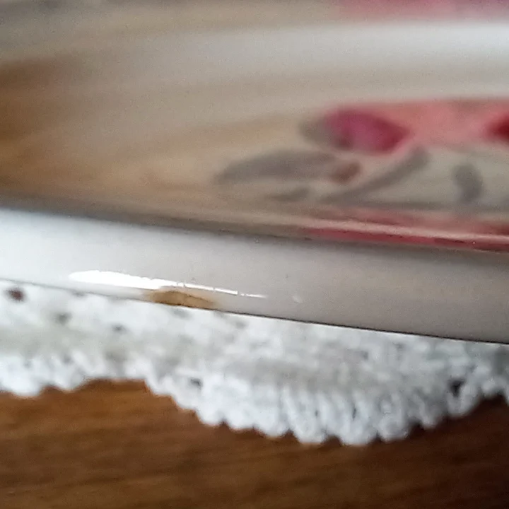 Un éclat assez important est présent sur le verso du plat, ainsi que 2 petits sur le bord sont constatés.