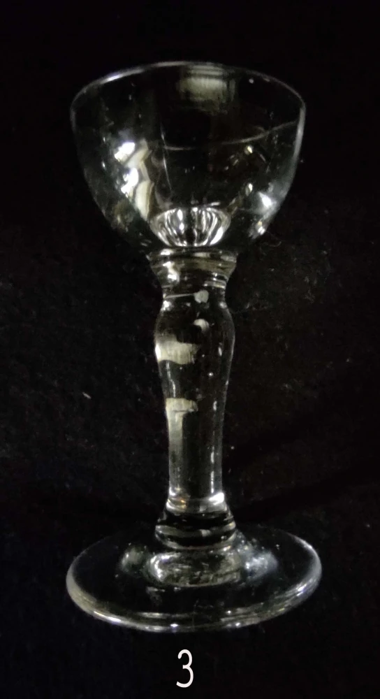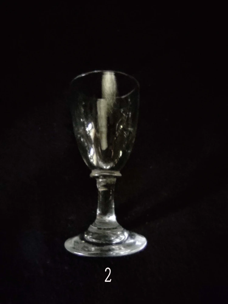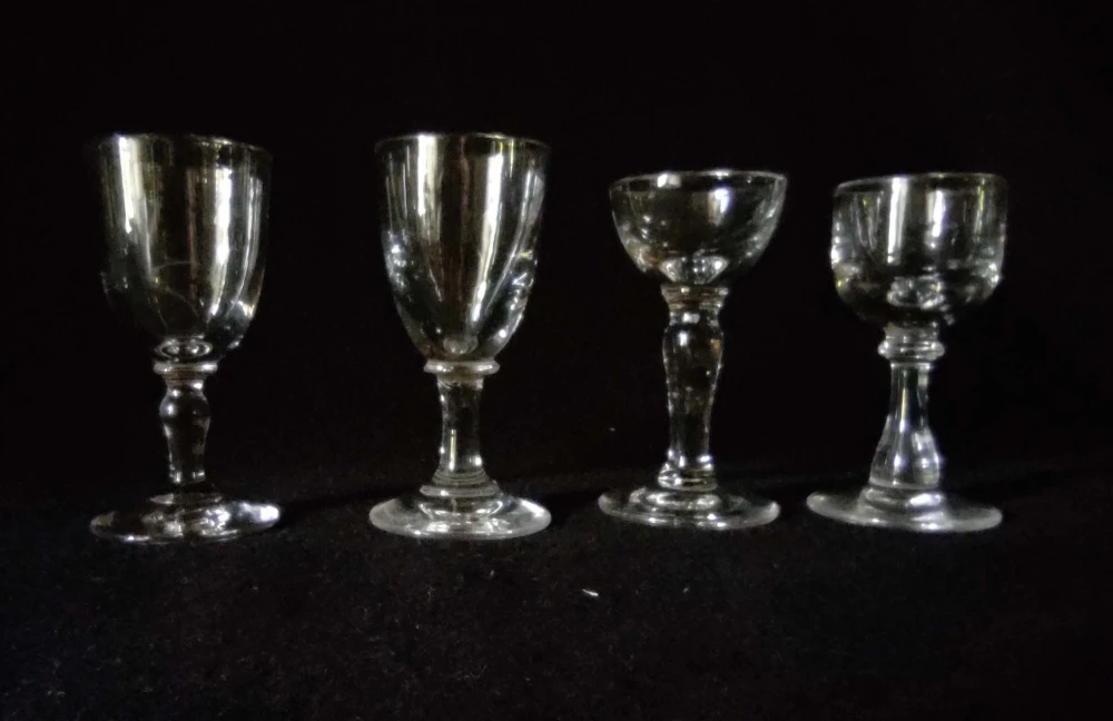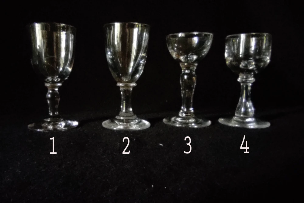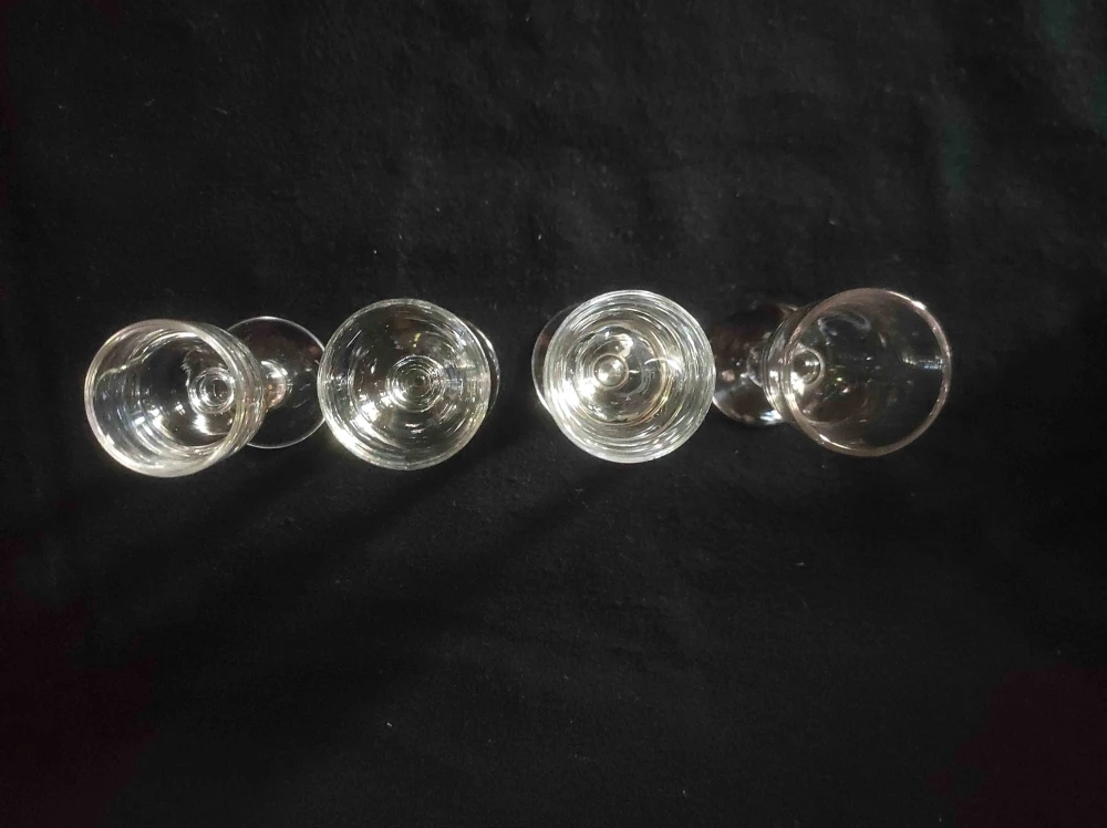 Verre soufflé non moulé, présence de fines bulles. Dimensions des verres : n° 1, hauteur 8 cm, ø 3, 8 cm|n° 2, hauteur 7, 8 cm, ø 3, 7 cm|n° 3, hautuer7, 4 cm, ø 3, 9|n° 4 hauteur 7, 3 cm, 3, 8 cm. Très bon état. Poids environ 45 gr par verre. [ugs 166]