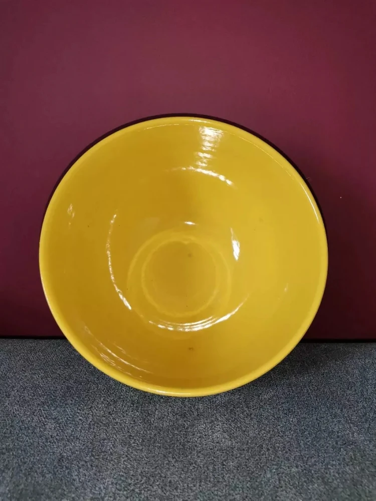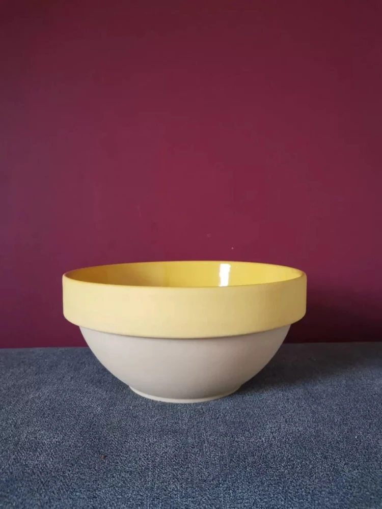 Saladier émaillé jaune en intérieur. De la manufacture de Digoin. 2 petites tâches sous email.