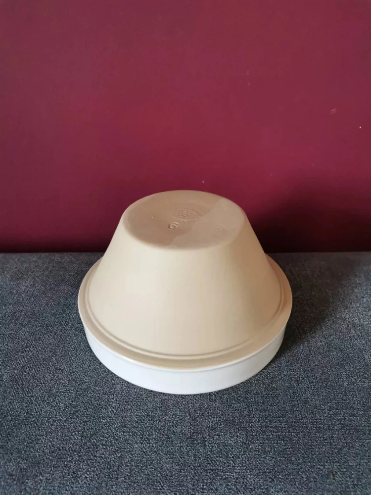 Saladier émaillé blanc à l’intérieur. Avec bec verseur. De la manufacture de Digoin. 1 défaut de fabrication sous emmaille 1cm environ.