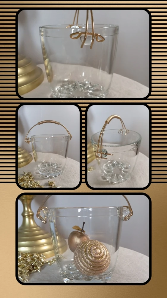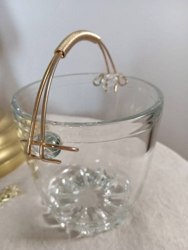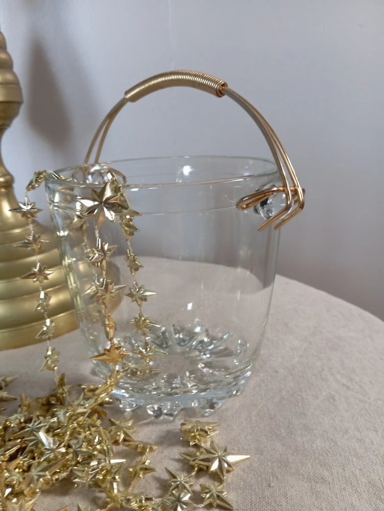 Seau à glace, arrondi, poignée originale qui pivote autour des anses, en métal doré.