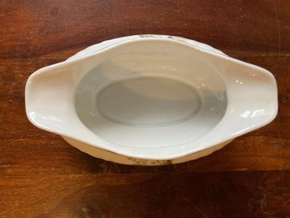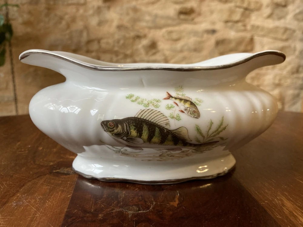 Service à poisson comprenant 1 plat de service, une saucière et 6 assiettes. Bon état, quelques marques d’usage et liserés dorés un peu passés. Petite ébréchure sur l’une des assiettes (en photo).