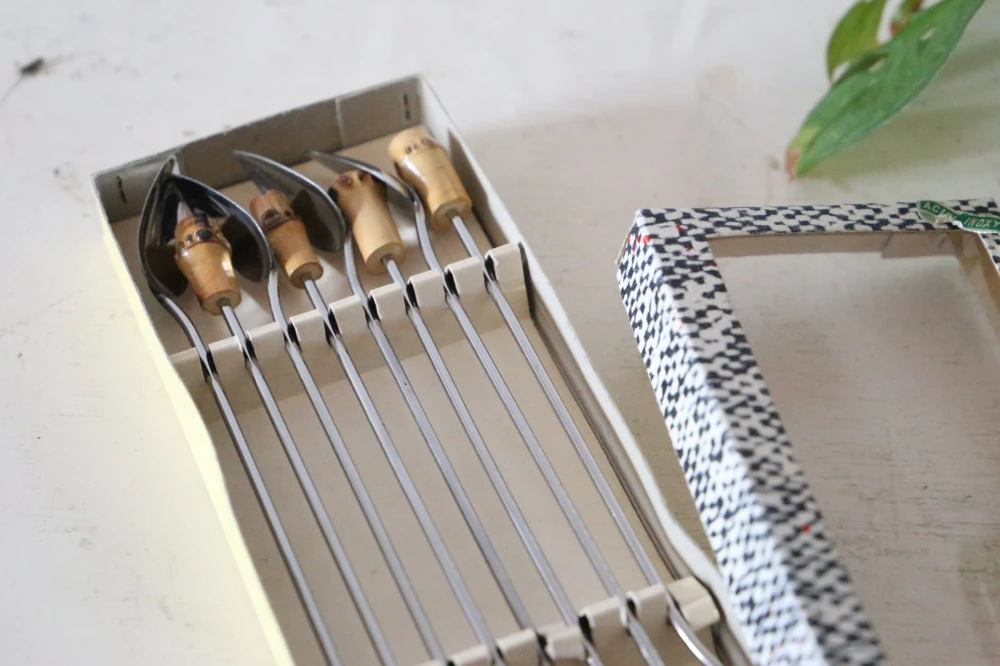 Voici un ensemble de cuillères à confiture, 8 au total, dans leur boite d’origine, en inox et bambou. Neuves, elles sont donc en parfait état.