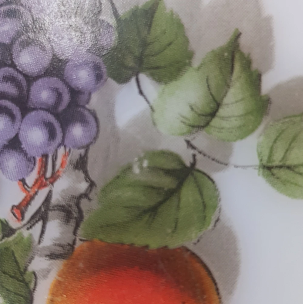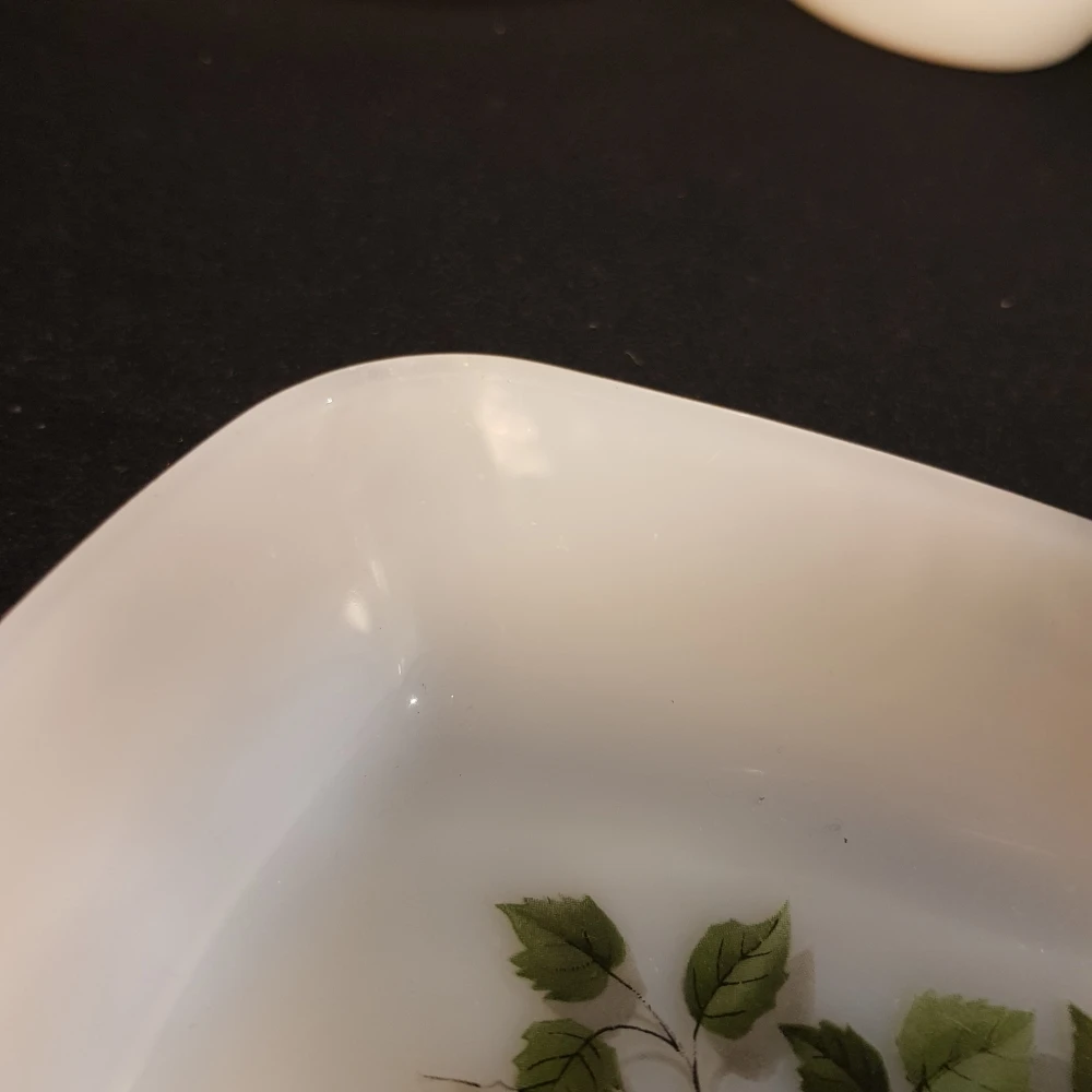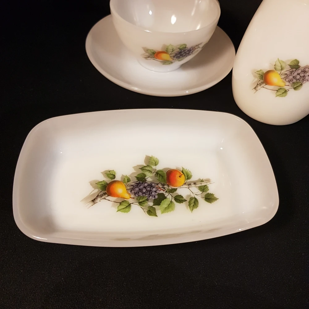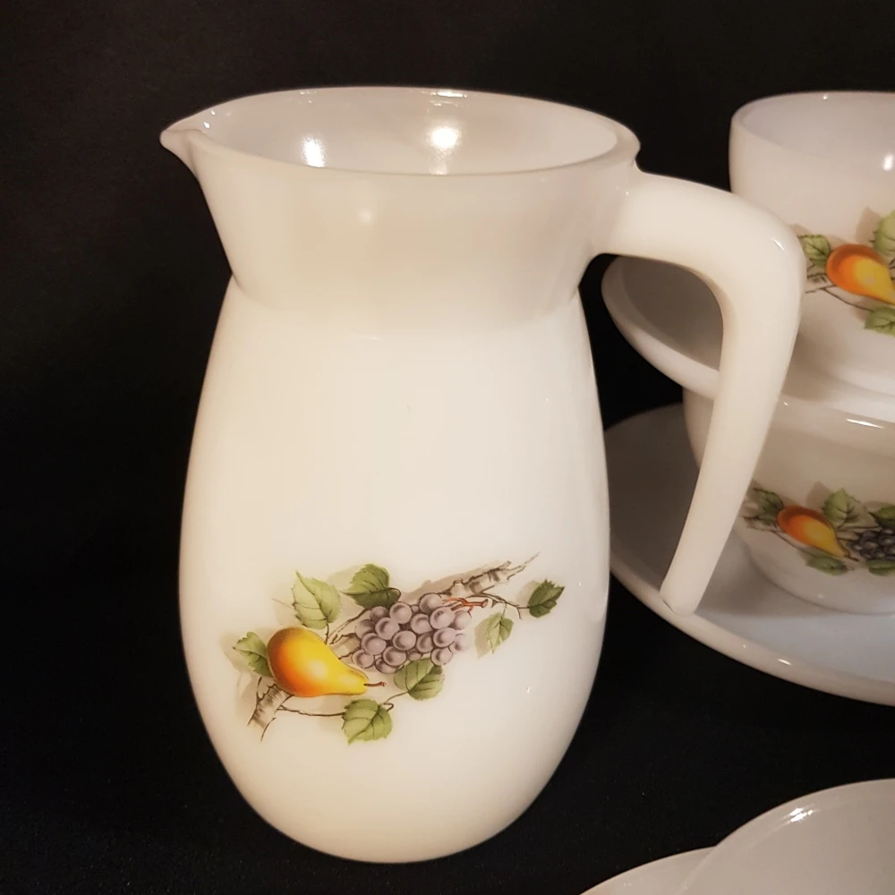 C’est l’heure du p’tit dej ! On retourne dans la années 70 avec ce service à petit déjeuner dans la série Fruits de France de chez Arcopal. Ce service comprend 4 tasses et sous-tasses, un pot à lait et un ravier. Tasse : diam haut 10,5 cm, diam bas 5 cm, hauteur 6 cm, sous-tasse diam 15,5 cm, Pot diam col 7 cm, diam bas 7 cm, hauteur 14 cm, ravier 18 x 11,5 x 3,5 cm. A noter un petit défaut (manque) sur une des feuilles du ravier, une légère nuance de l’opaline dans un coin du ravier.