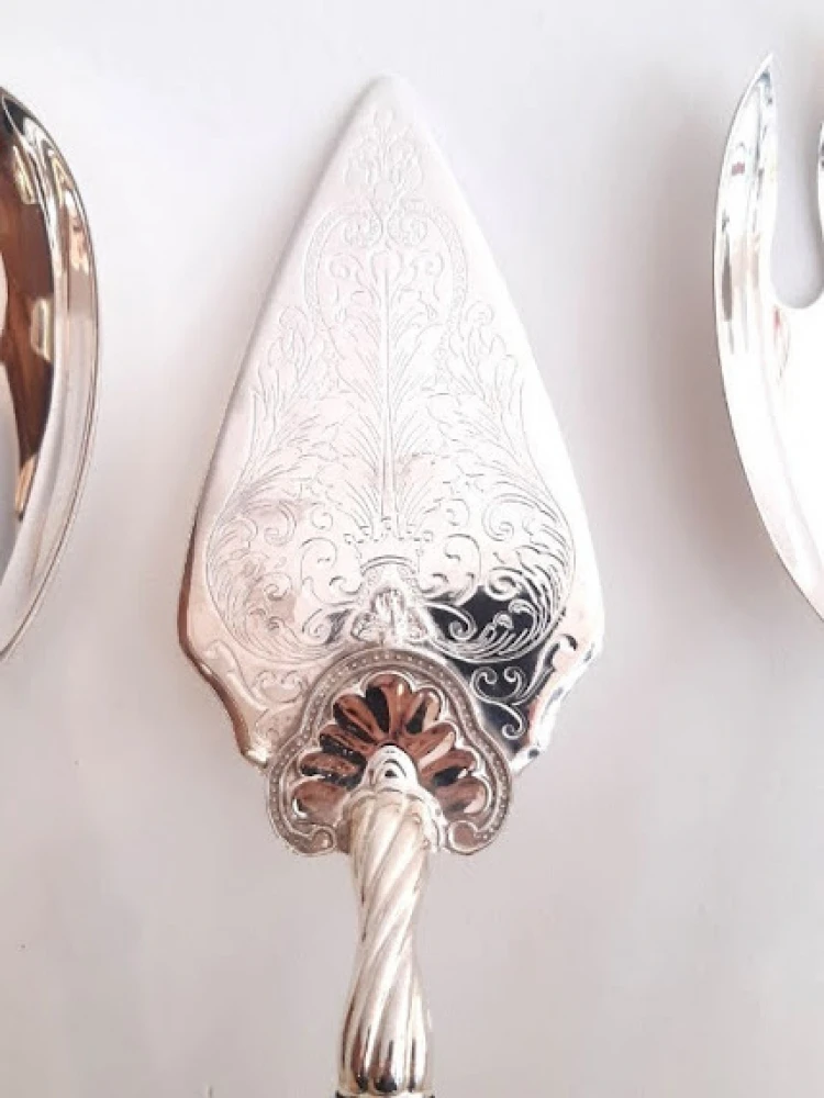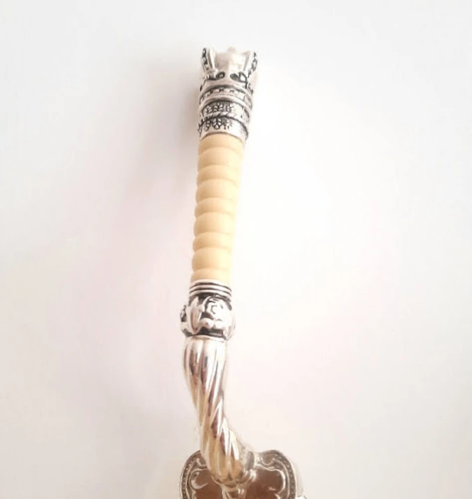 Set de quatre couverts de service en métal argenté. Manche en os godronné imitation ivoire avec monture métal argenté à motifs de couronnes.