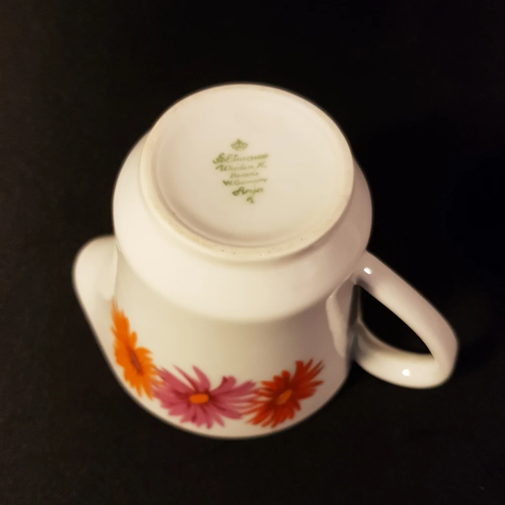 La tarte sort du four, le café continue de couler, tout le monde s’installe autour de la table ou sont déjà présente les tasses et assiettes et au centre de la table ces jolis sucrier et pot à lait, on ne voit qu’eux avec leurs couleurs flamboyantes, un souvenir des années 70 issu d’une grande maison, la collection Anja de chez Seltmann Weiden. Bel état, un petit cheveu sur le pot à lait. Sucrier : diam 9,5 x h 10,5 cm, pot à lait : diam 8,5 x L 12 x h 8,5 cm.