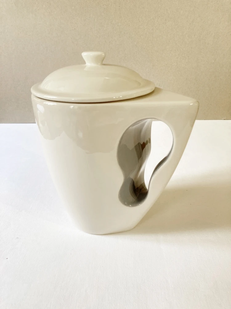 Jolie théière contemporaine en céramique blanc crème avec anse au lignes organiques rehaussée de gris. Couvercle à bord profond avec petits trous pour filtrer les herbes mises en infusion. Un petit éclat de l’émail sur le couvercle, sans gravité, sinon, très bel état de l’ensemble.