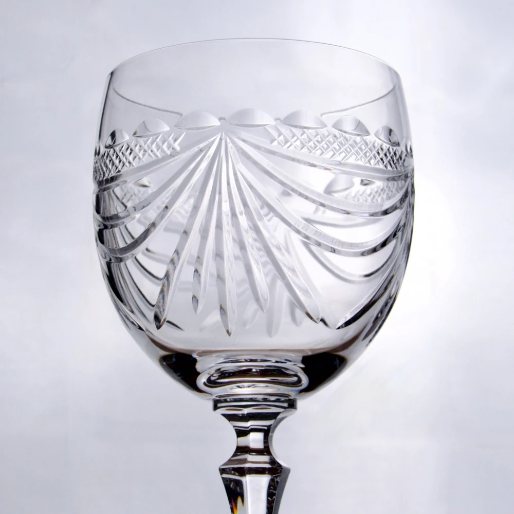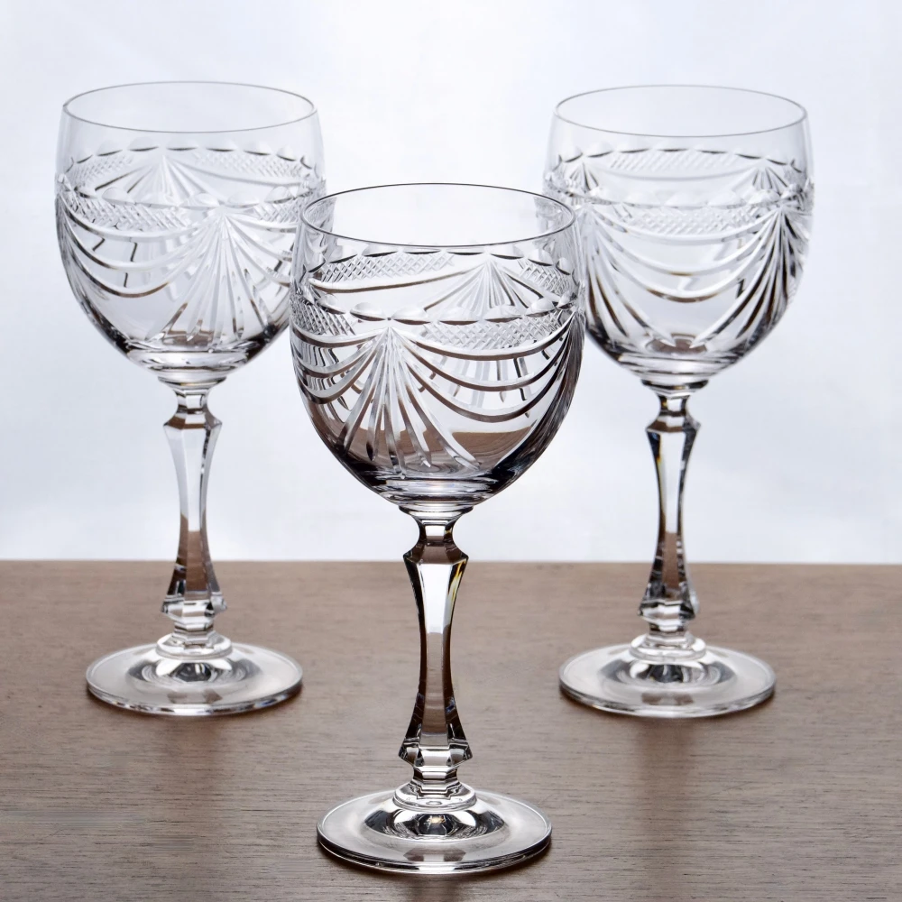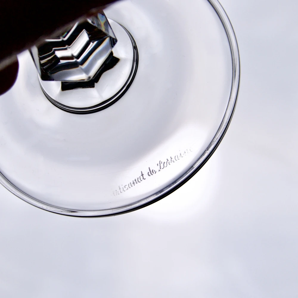 Ensemble de 3 grands verres à pied anciens, en cristal soufflé bouche et taillé à la main, gravés “artisanat de Lorraine”, modèle Gérard.